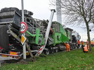 · Waarschijnlijk raakte de vrachtenwagen van de weg waardoor het tegen de bewegwijzering botste. Er raakte niemand gewond.