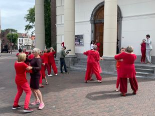 · Senioren van top tot teen gekleed in het rood, een camera en een grote speaker trokken woensdag flink wat bekijks op de Markt in Roosendaal.