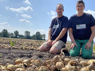 · Veel mensen hadden er een zondagsuitje van gemaakt om op het veld van boer Jan Aarden uien te gaan rapen voor vijftig cent per kilo.
