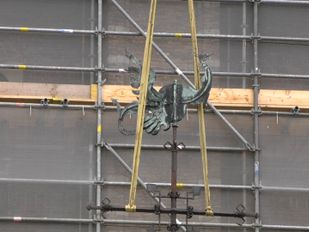 · Met behulp van een grote hijskraan werd de phoenix die op de top van de toren in Wouw stond naar beneden gehaald voor renovatie.