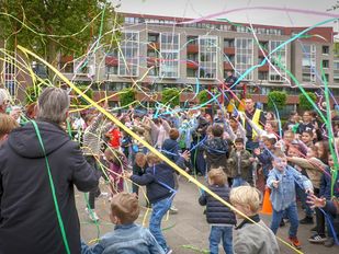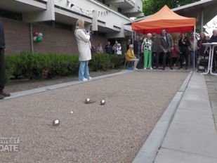 · Het was aan flatbewoonster mevrouw Tempelaars om de eerste bal op de baan te gooien.