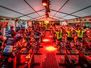 · Deelnemers fietsen in blokken van twee uur om geld op te halen voor onderzoek naar kanker. Ook is er een blok voor kinderen om mee te doen.
