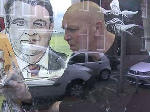 · “Zeg, wa kost da?“. Kunstenaar Frank Roks van 2CREA8 in Roosendaal heeft zijn schildersezel en pronkstukken in de etalage gezet.