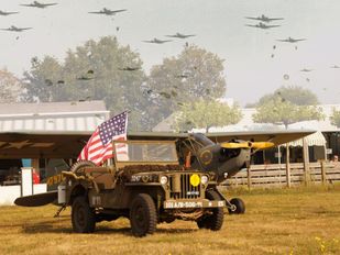 · De herdenking is niet alleen in de lucht, maar ook op de grond; met lezingen en oude voertuigen. En de fanfare speelt muziek uit die tijd.