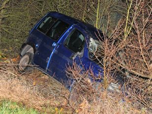 · In een flauwe bocht reed de bestuurder van het busje rechtdoor, waarna het voertuig een dijkje opreed.