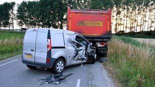 · De impact van de aanrijding was aanzienlijk: de achterzijde van de voorste vrachtwagen drong dwars door de voorruit van de bestelauto.