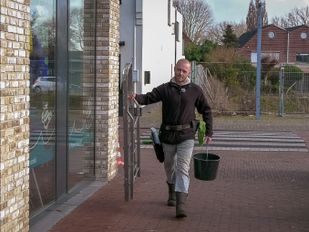 · Dennis van der Hoeven uit Putte maakt kosteloos de ramen schoon van winkeliers die wegens de coronalockdown weinig omzet hebben.