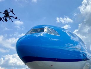 · Vliegtuigen worden regelmatig geïnspecteerd op deukjes en scheurtjes. Op vliegbasis Woensdrecht neemt een drone dit karweitje voor haar rekening.