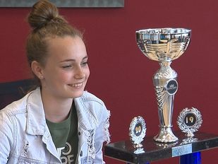 · Burgemeester Steven Adriaansen en wethouder Hans de Waal van de gemeente Woensdrecht hebben Demi Kuijstermans woensdag in het zonnetje gezet.