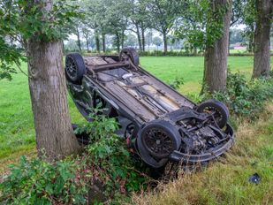 · Door de heftige impact raakte de auto van de weg en kwam op zijn dak in de sloot terecht.