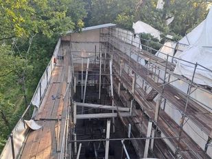 · Het dak is zijn geheel van de tent gewaaid en deels op het dak van een loods terechtgekomen.