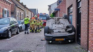 · Bij een ongeluk in de Lagestraat in Rijsbergen is een auto op zijn kop tegen de gevel van een huis terecht gekomen.