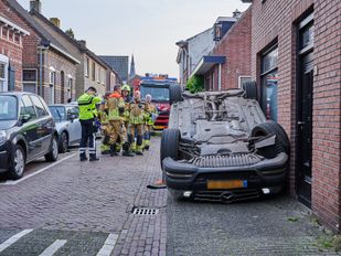 · Bij een ongeluk in de Lagestraat in Rijsbergen is een auto op zijn kop tegen de gevel van een huis terecht gekomen.
