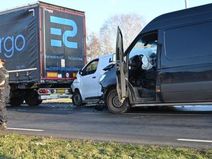 · Door de klap kwamen de busjes tegen elkaar en tegen de vrachtwagen vast te zitten. Hoe het ongeluk kon gebeuren is niet bekend.